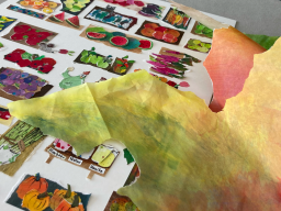 gestalte ich in Collagentechnik aus handbemalten Papieren: ich experimentiere dazu seit vielen Jahren mit Farbaufträgen und Lasuren in Öl- und Acrylfarbe, um expressive Strukturen zu erhalten. Diese dienen mir dann als Inspiration für meine späteren Arbeiten. Aus den Papieren gestalte ich in Feinarbeit mit Pinzette, Zahnstocher und Cutter bunte Szenerien, die zum Suchen, genauen Hinschauen und sehr oft auch zum Schmunzeln einladen.